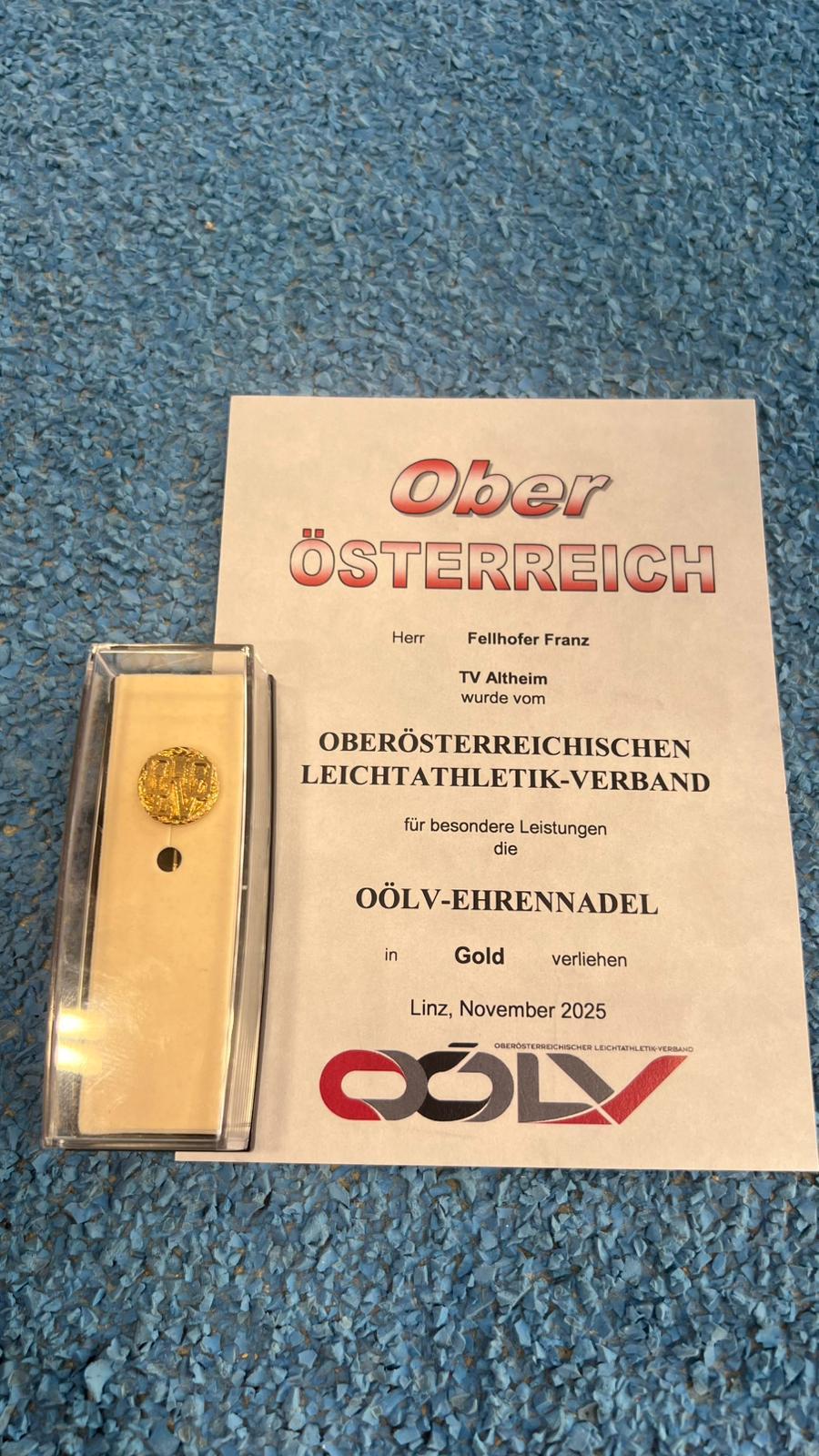 Ein besonderer Höhepunkt der Meisterschaften war die Ehrung von Franz Fellhofer vom Turn-Verein Altheim. Im Rahmen der Veranstaltung wurde ihm die Ehrennadel in Gold des Oberösterreichischen Leichtathletik-Verbandes (OÖLV) verliehen. Diese Auszeichnung würdigt seine über 30-jährige Tätigkeit als Vorstandsmitglied, Leichtathletikwart, engagierter Nachwuchsförderer und aktiver Masters-Athlet.